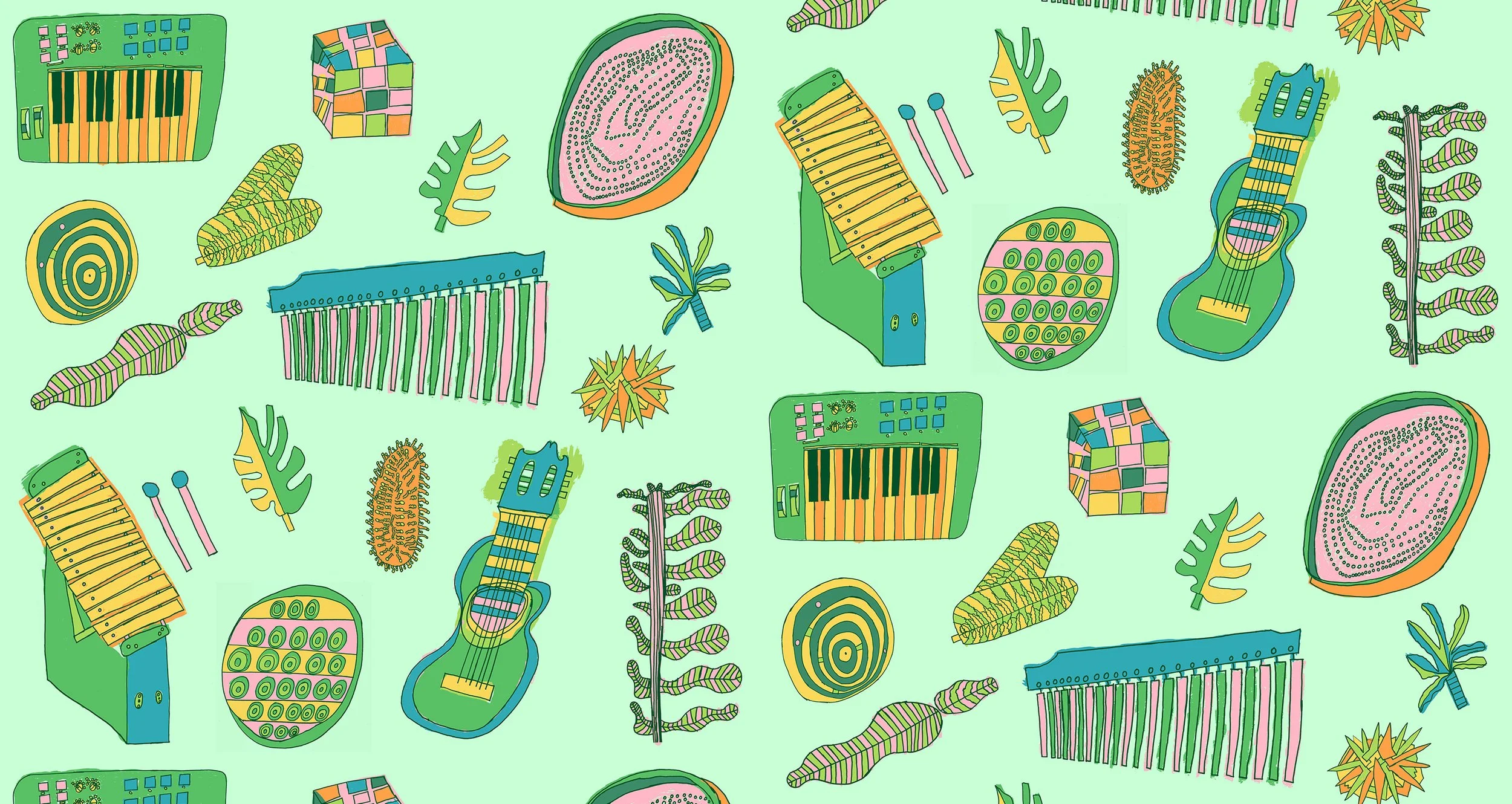 Andre was asked to create artwork inspired by the objects used in this space, including musical instruments and sensory toys. He combined his drawings with layers of handmade textures and shapes to form his design. The repeat patterns were digitally printed for the curtains and instrument cupboards, while his original drawings have been scaled up to create a large, hand-painted wall mural.